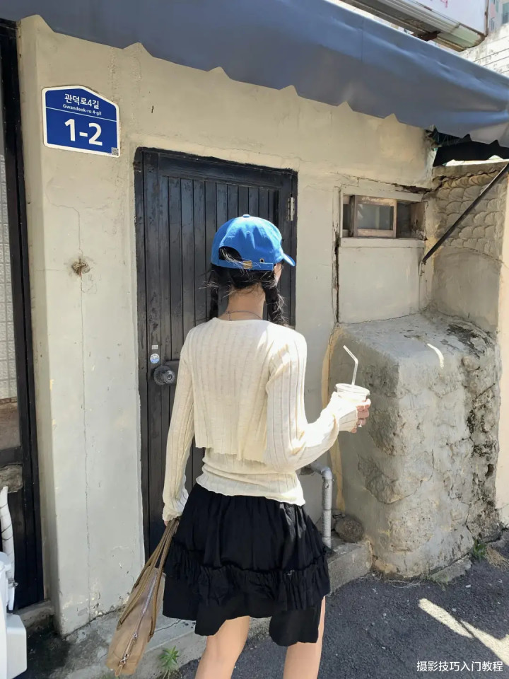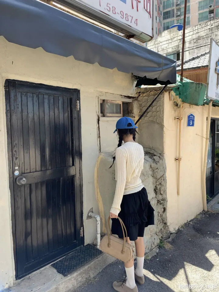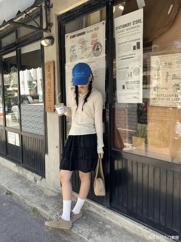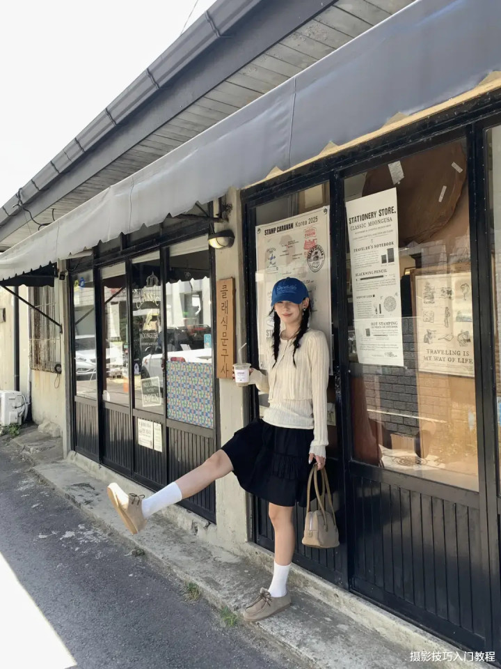 背靠着店铺的门窗,手里拿着饮料,包包,低头看向地面,或者是向前踢起一条腿,拍出来的照片有种不经意的美。