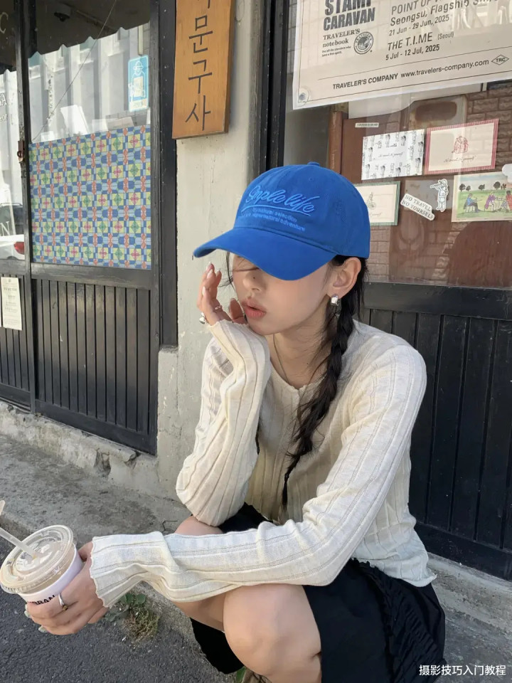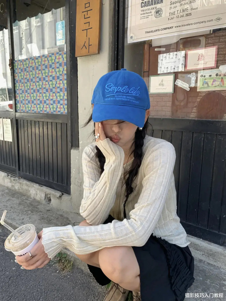 街道上找一家有特色的小店铺,蹲下来,单手托腮,另一只手拿着饮料搭在膝盖上。