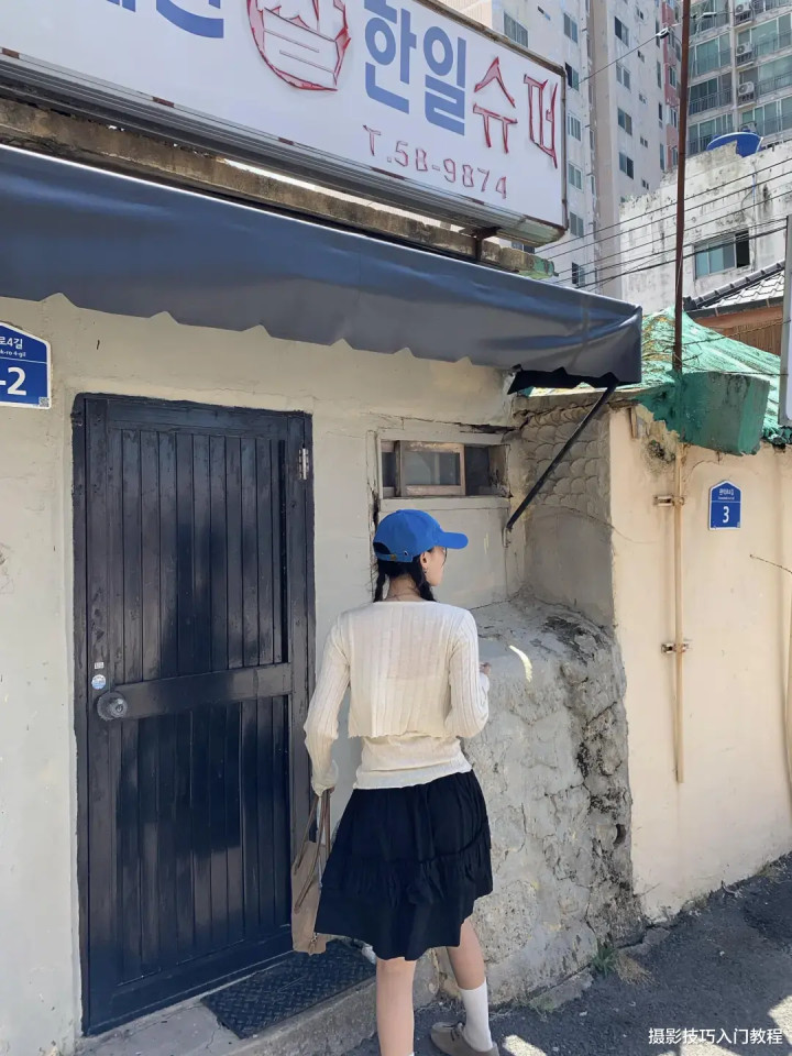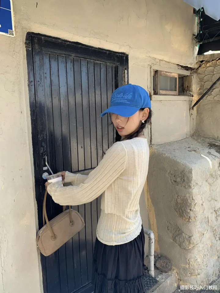 大场景拍多了,也可以选择一个小场景拍近景,比如说,模特抓着路边的门框,扭头看向镜头。